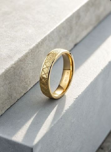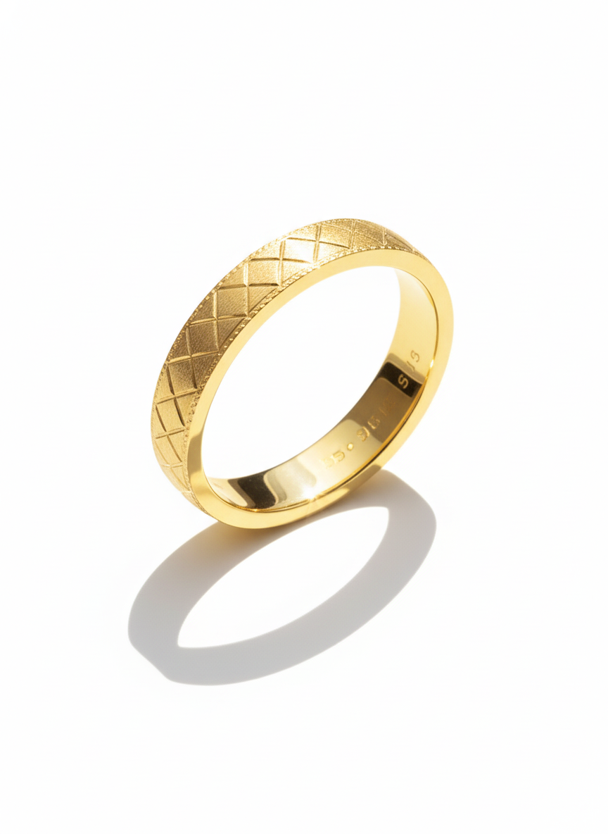 • Diseño: Anillo de oro amarillo con una superficie completamente cubierta por un patrón geométrico repetitivo de rombos o triángulos. Esta técnica de grabado se asemeja al estilo Guilloché en relieve.