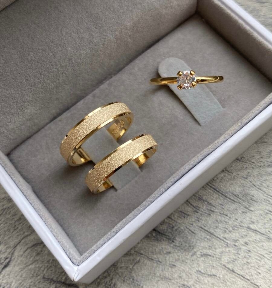 Diseño: Es un juego de tres piezas: Un anillo solitario con una piedra redonda en un engaste de cuatro, montura simple y dos alianzas. Las alianzas tienen un acabado completamente texturizado tipo «arena».