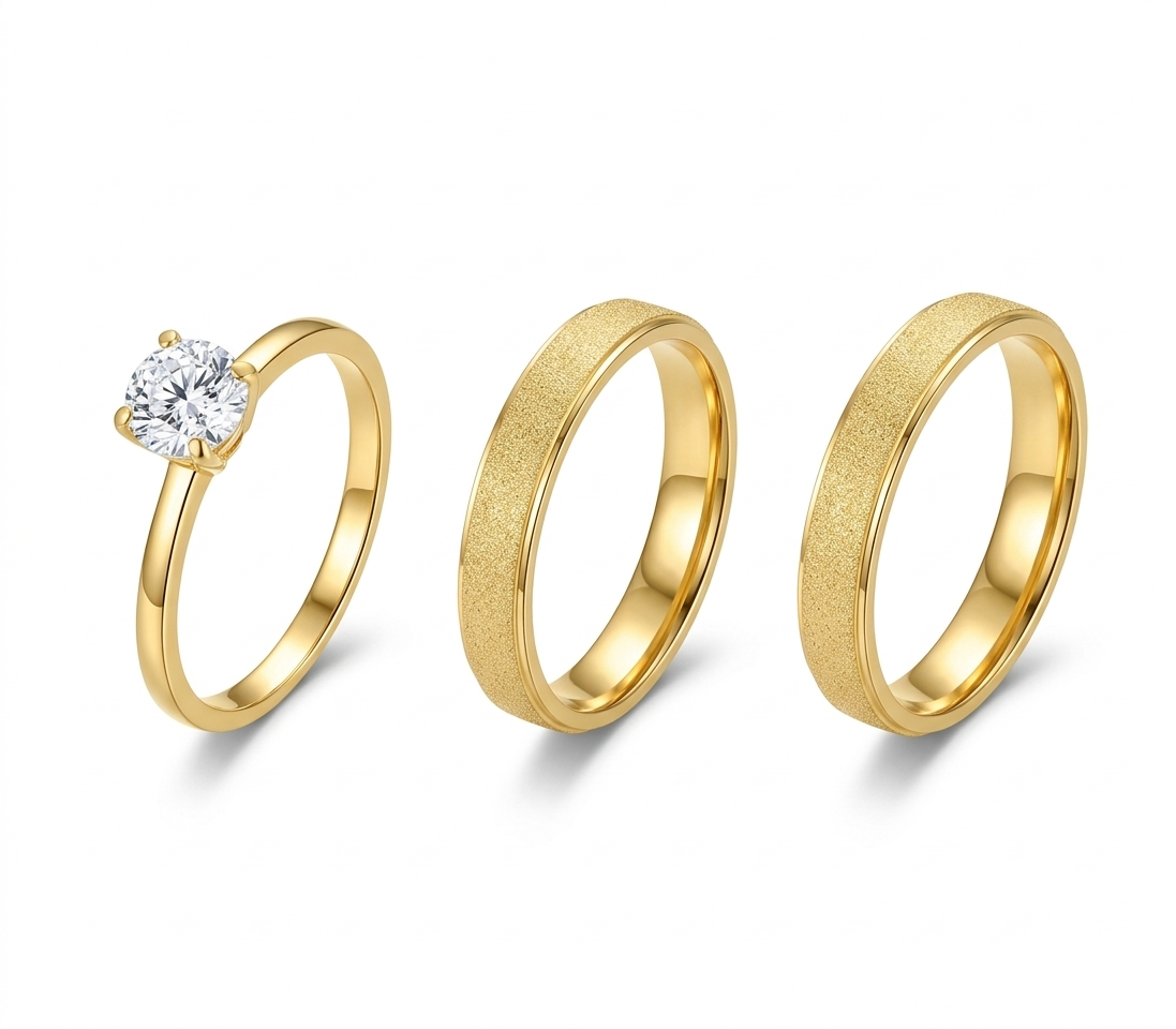 Compromiso: Un solitario estilizado de banda lisa y pulida, diseñado para contrastar con la textura de las alianzas de boda.