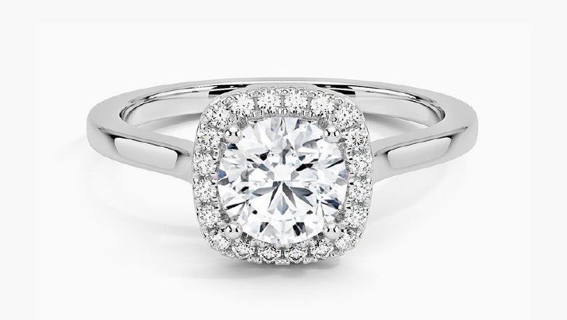 – Diseño: Se trata de un anillo de compromiso con halo cuadrado. Presenta un gran diamante central redondo enmarcado por un marco completo de pequeños diamantes redondos que forman un cuadrado con esquinas redondeadas. La banda es de metal liso y pulido, sin diamantes adicionales, lo que hace que la montura central destaque. Las garras son finas y discretas.