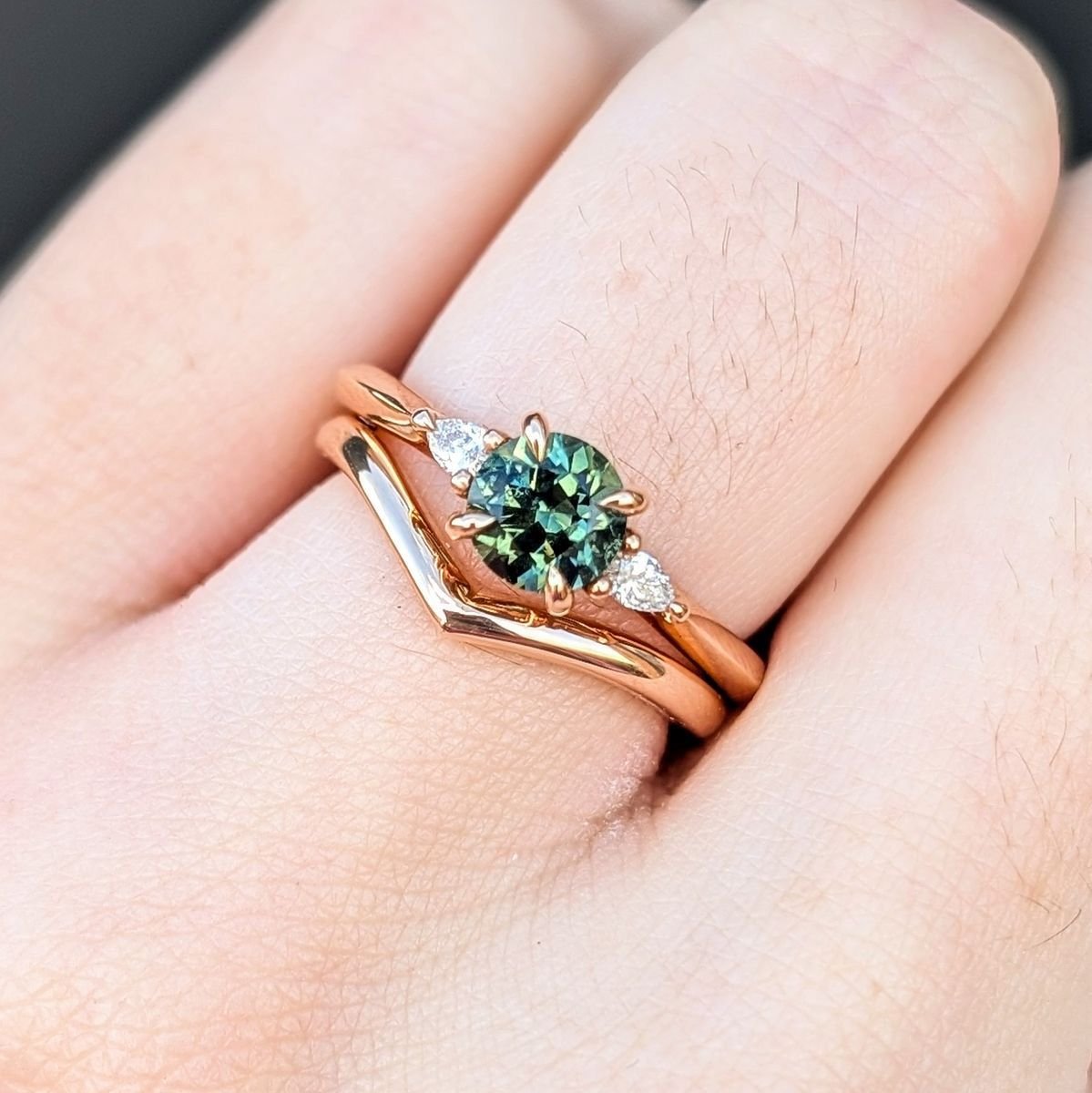 Diseño: Conjunto de dos anillos: solitario con gema central redonda con engaste de 6 garras, flanqueada por diamantes talla pera y una alianza curva en forma de «V».