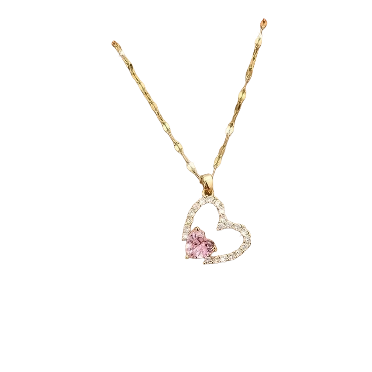 • Diseño: Dije de corazón con estructura abierta adornado con pavé de cristales, destacando un segundo corazón sólido en el interior.