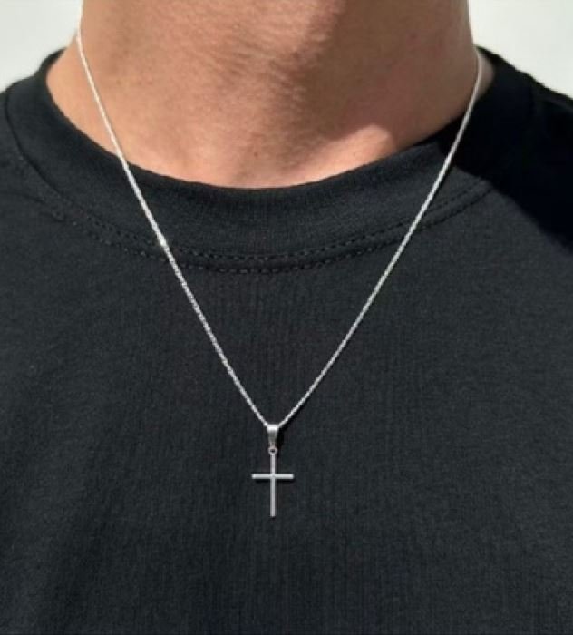 • Diseño: Se compone de una cadena de eslabones delgados y discretos que sostiene un dije de cruz latina. El colgante tiene un acabado pulido, con líneas rectas y bordes definidos que le otorgan un aspecto limpio y moderno.
