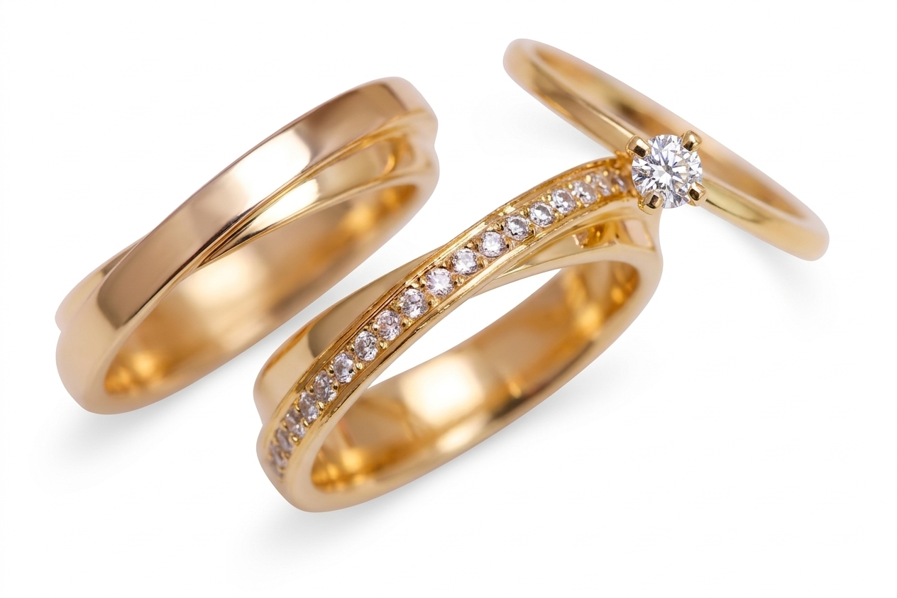 • Alianzas de Matrimonio: Presentan una estructura tipo «X» o cruzada, donde dos bandas se funden en una sola. La alianza femenina está adornada con una hilera de piedras en una de sus secciones cruzadas.