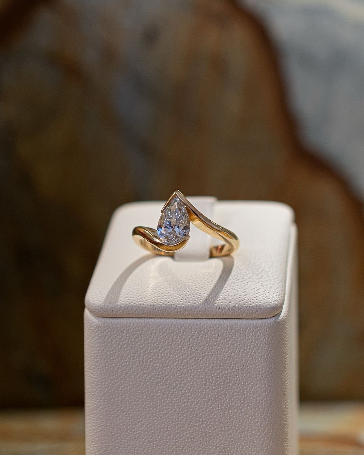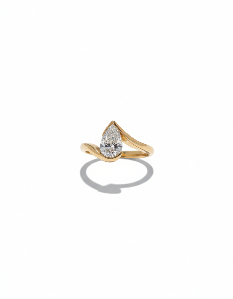 • Diseño: Engaste envolvente o «Tensión Swirl», donde la banda de oro se curva para abrazar y sostener una gema central sin garras visibles. La piedra está tallada en forma de pera lágrima.