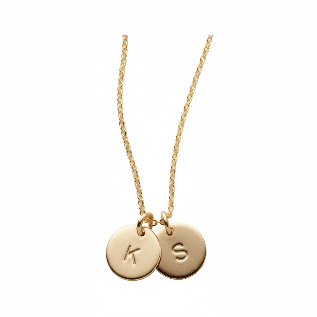 • Diseño: Este collar presenta dos delicados dijes circulares con las iniciales grabadas. Los dijes cuelgan de una fina cadena.