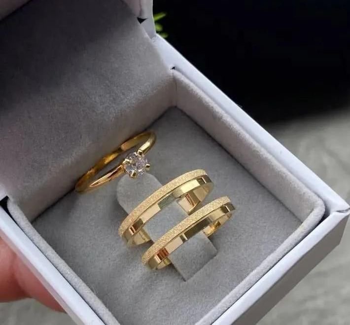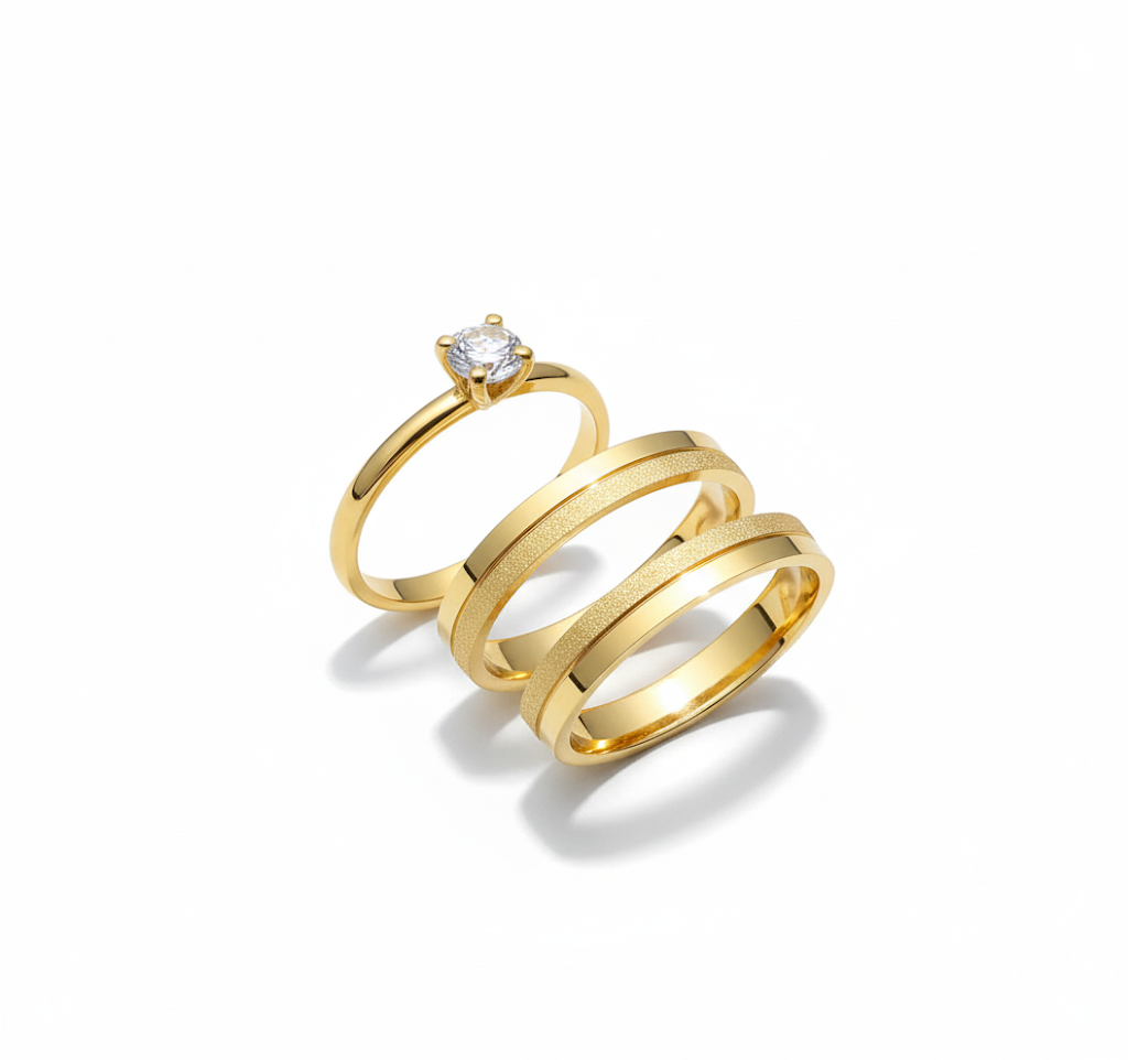 Diseño: Es un juego de tres piezas. Un solitario con una gema redonda en un engaste clásico de 4 garras, y dos alianzas anchas. Las alianzas presentan una franja central con un acabado de textura rugosa o «arenado», y los bordes pulidos.