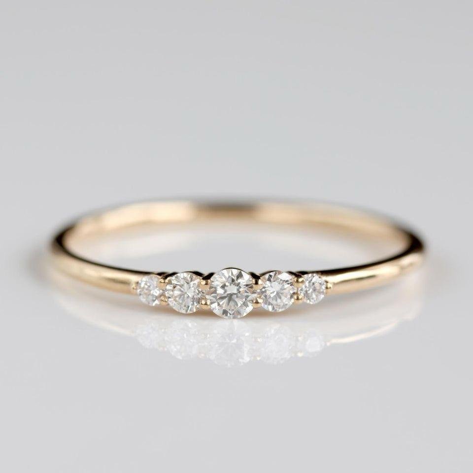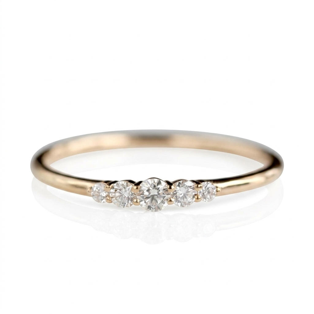 Diseño: Banda ultra delgada de perfil redondeado con un degradado de cinco piedras frontales que aumentan de tamaño hacia el centro.
