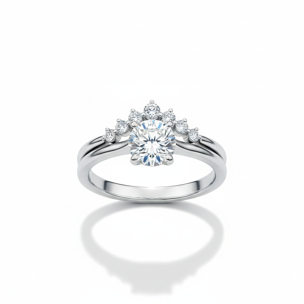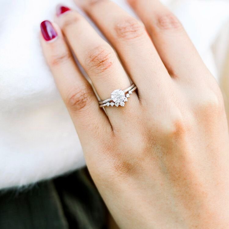 Diseño: Dos anillos: Un solitario con una piedra central redonda en engaste de garra. Una alianza curva con múltiples piedras de diferente tamaño dispuestas en forma de corona o racimo, diseñada para anidar con el solitario.