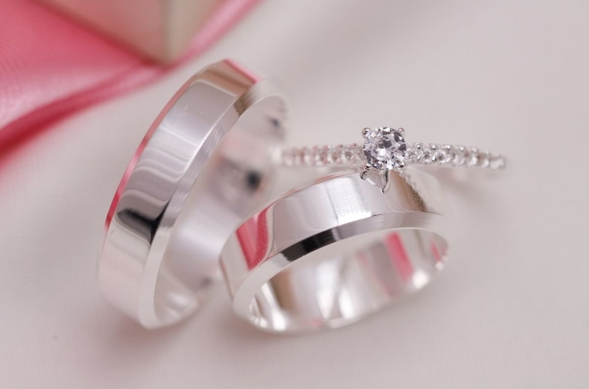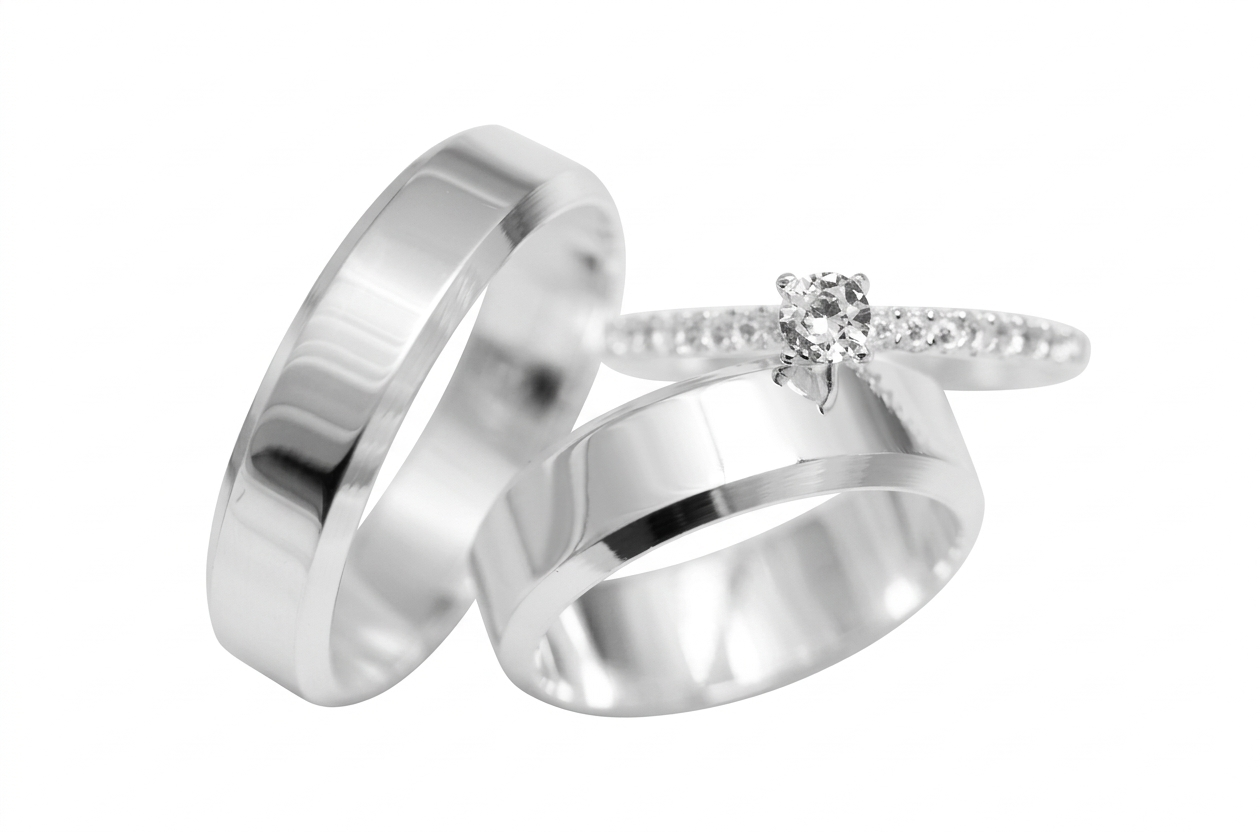 Estilo: Minimalismo Galante. Es un conjunto que equilibra la robustez y anchura de las alianzas con la delicadeza brillante del compromiso, ideal para quienes buscan un look frío, pulcro y sofisticado.