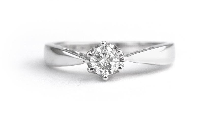 -Piedra: Diamante blanco de corte redondo brillante. La gema está sujeta por un engaste de seis garras redondeadas, lo que garantiza una sujeción firme y permite que la luz entre desde todos los ángulos para maximizar su fuego. (Todas las piedras se pueden personalizar).