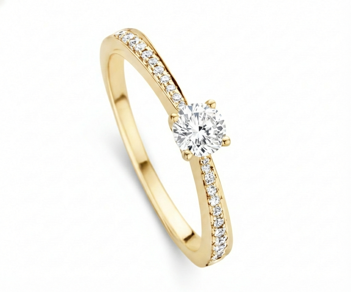 • Diseño: Anillo solitario con banda delgada y pavé lateral delicado.