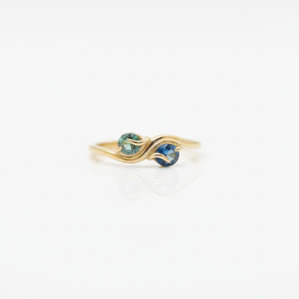 • Diseño: Anillo abierto con dos piedras redondas enfrentadas, unidas por una banda dorada con curvas suaves y elegantes.