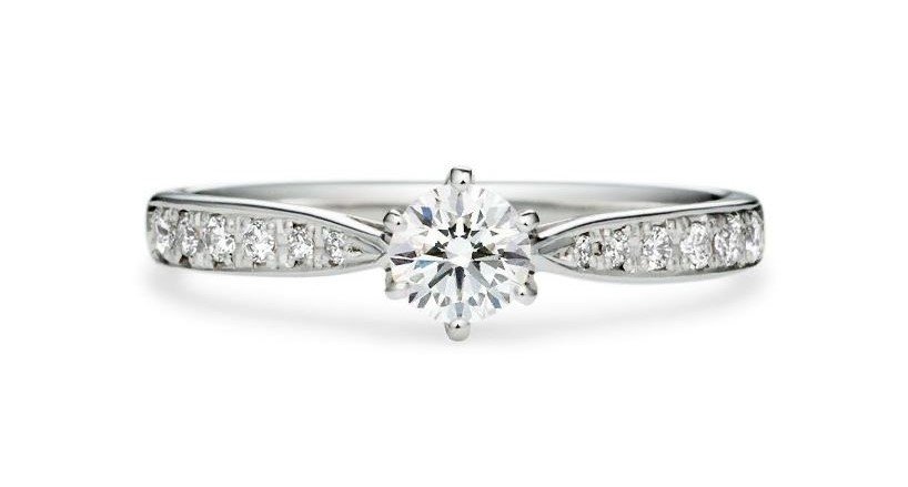 – Diseño: Un solitario clásico con hombros decorados. Presenta un diamante central elevado mediante un engaste de seis garras, que dirigen la mirada hacia la piedra principal. La banda es pulida y presenta una fila de diamantes más pequeños en micropavé engastados en el metal, que aportan un brillo adicional sin robar protagonismo al diamante central.