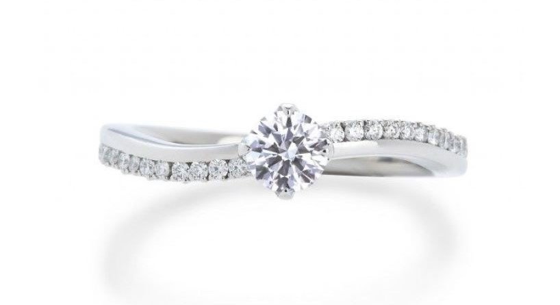 – Diseño: Presenta una banda con curvatura tipo «bypass» u ondulada, que envuelve delicadamente la piedra central. Una mitad de la banda es de metal liso y pulido, mientras que la otra está decorada con un pavé de diamantes pequeños.