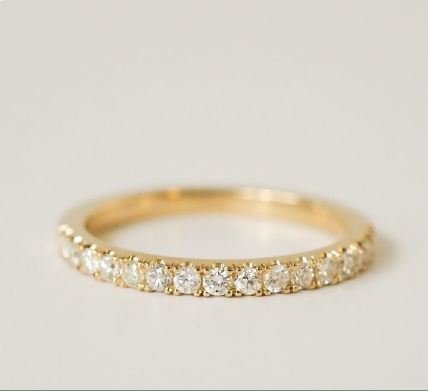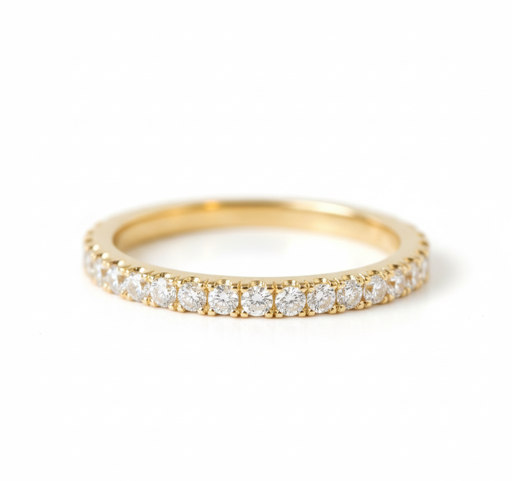 Diseño: Tipo Eternity completa, con un engaste de micro-pavé o granos que permite que las piedras cubran todo el perímetro de la banda de oro amarillo.