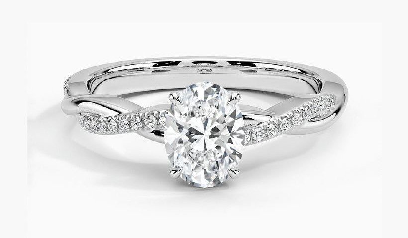 – Diseño: Se trata de un solitario con banda entrelazada. La montura presenta dos hilos de metal que se cruzan elegantemente: uno liso y pulido, y otro adornado con un pavé de diamantes, creando un efecto de movimiento que converge en la gema central.