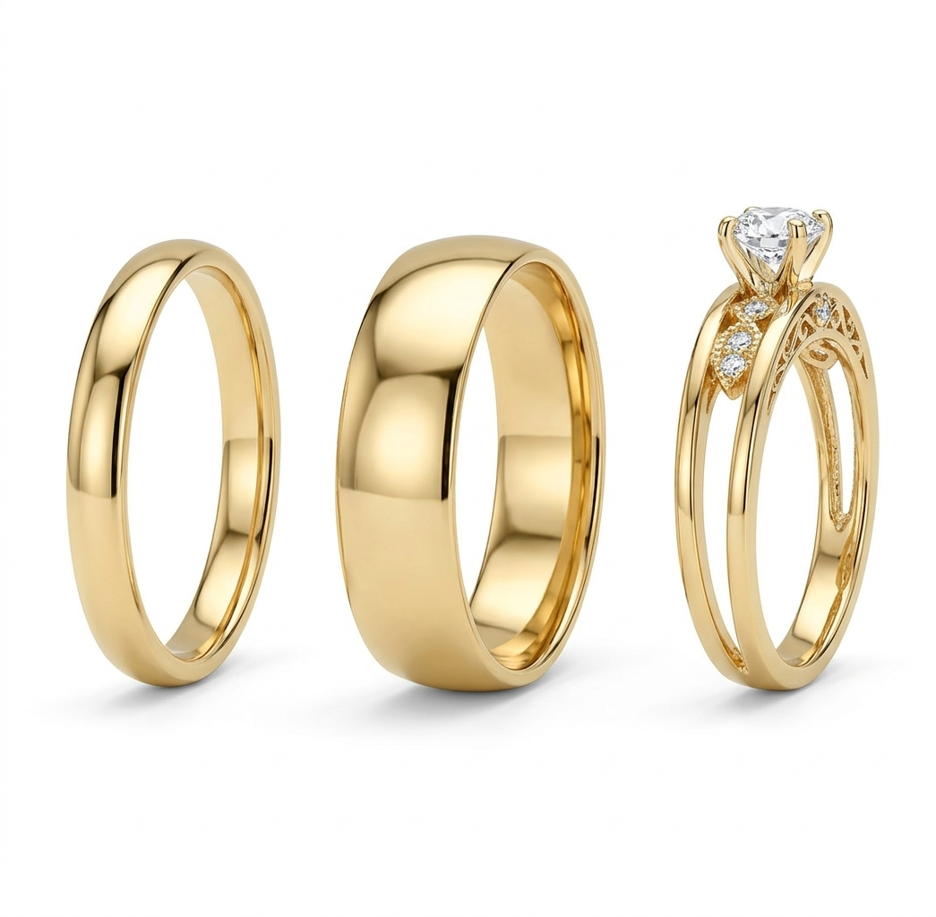Dos alianzas de matrimonio de perfil redondeado y liso, diseñadas para el grabado interno personalizado.