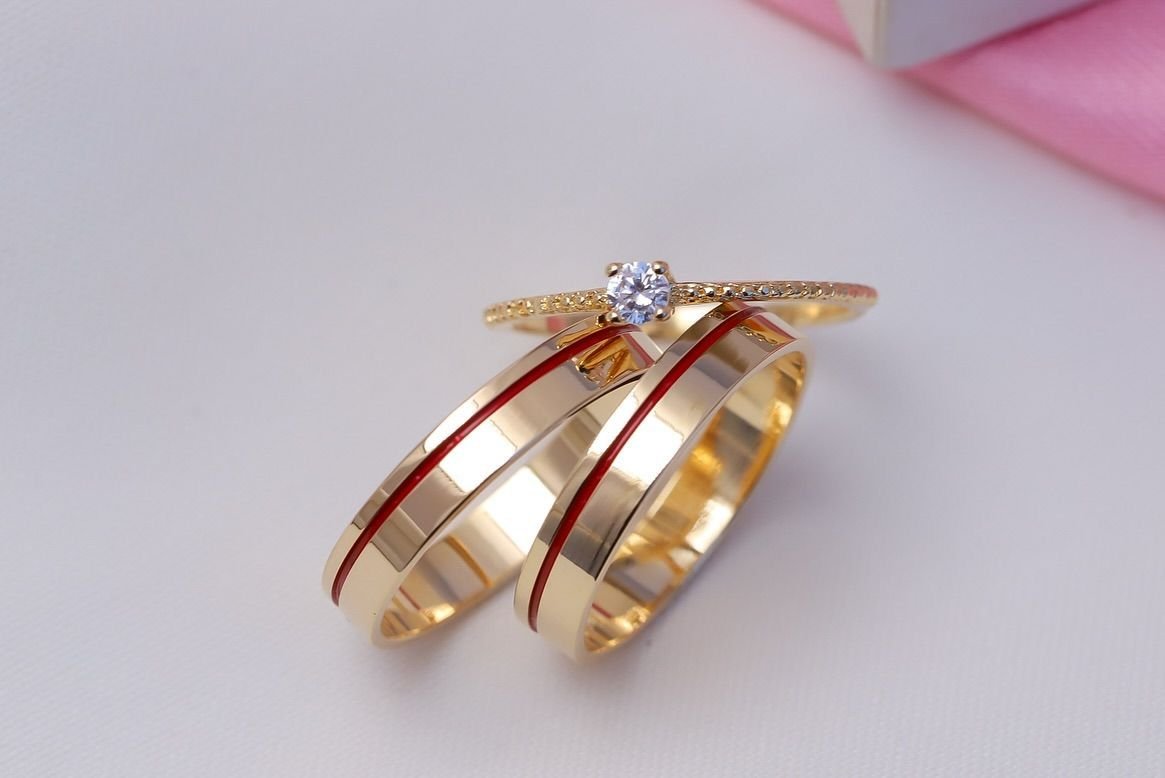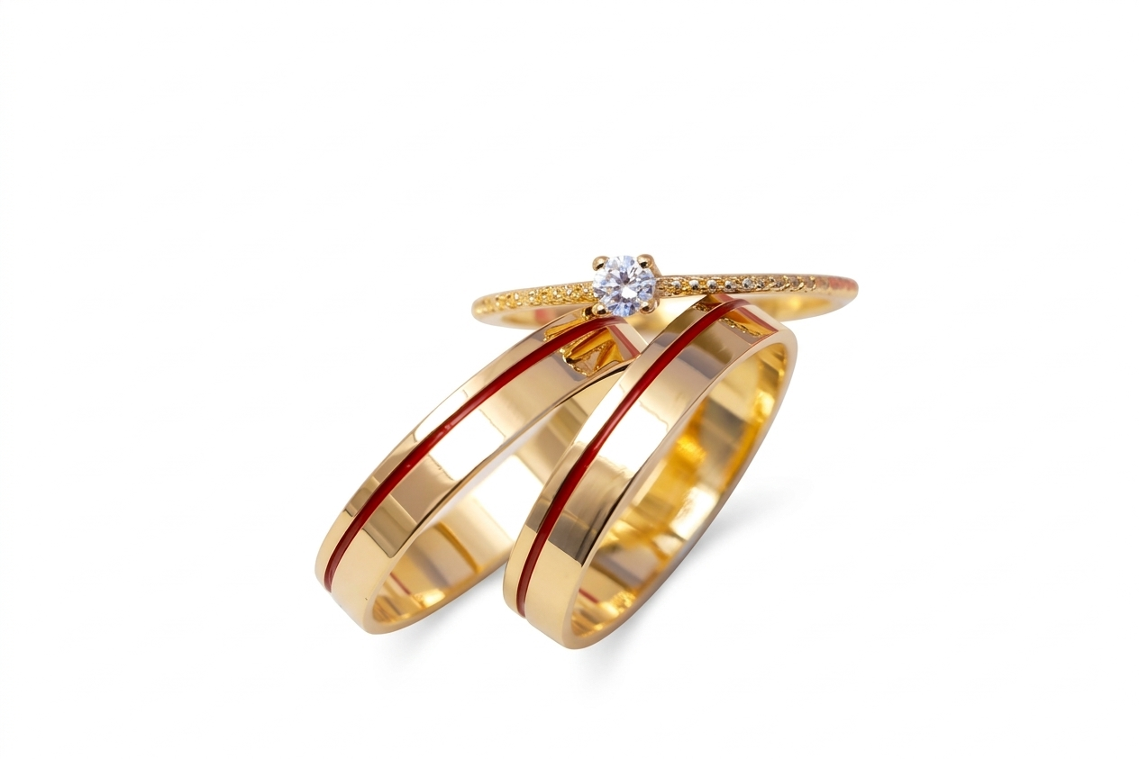 Alianzas de Matrimonio: Son bandas de estilo plano y ancho medio, con un acabado pulido de alto brillo. Lo más llamativo es una fina línea central de esmalte rojo intenso que recorre toda la circunferencia del aro, creando un contraste vibrante con el metal dorado.