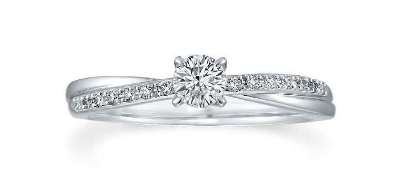 – Diseño: Se trata de un solitario con banda cruzada o entrelazada. La característica más distintiva es que la banda se bifurca y se cruza justo debajo del diamante central, creando la apariencia de dos hilos o caminos que se unen. Una de las bandas es lisa y pulida, mientras que la otra está adornada con un pavé de diamantes pequeños, lo que añade brillo y textura. El engaste de la piedra central es de cuatro garras discretas.