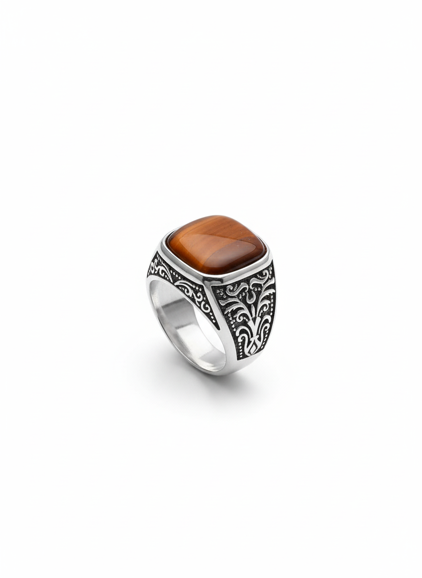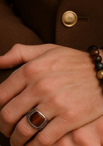 Significado: El anillo sello representa poder e identidad. El Ojo de Tigre es una piedra que se asocia con la protección, la buena suerte y el coraje, lo que le da un significado muy personal al anillo.