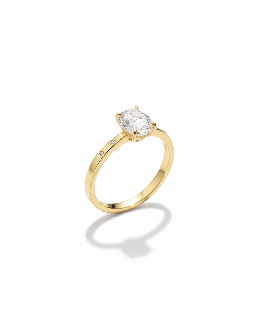 Estilo: Clásico, Atemporal y de Lujo. El corte ovalado y los acentos en la banda son muy populares para anillos de compromiso modernos.