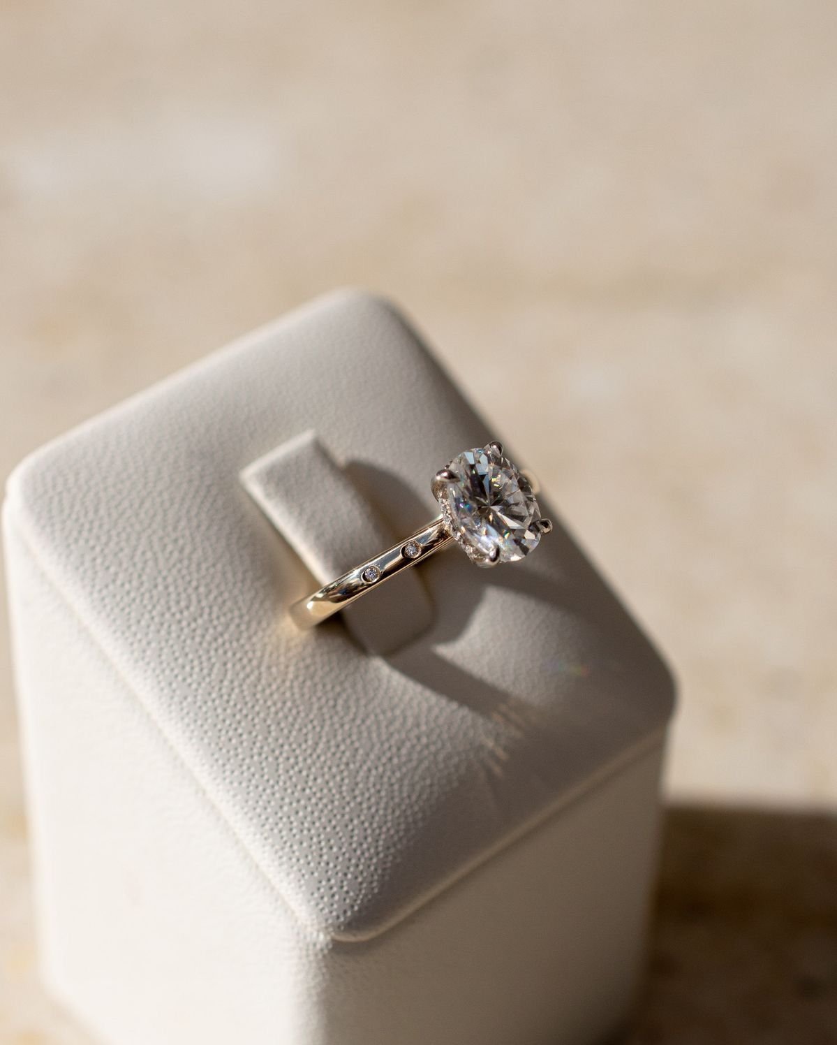 Diseño: Piedra central de corte ovalado en engaste de garra. La banda de oro tiene pequeñas piedras incrustadas solo en los hombros, o parte de la banda.