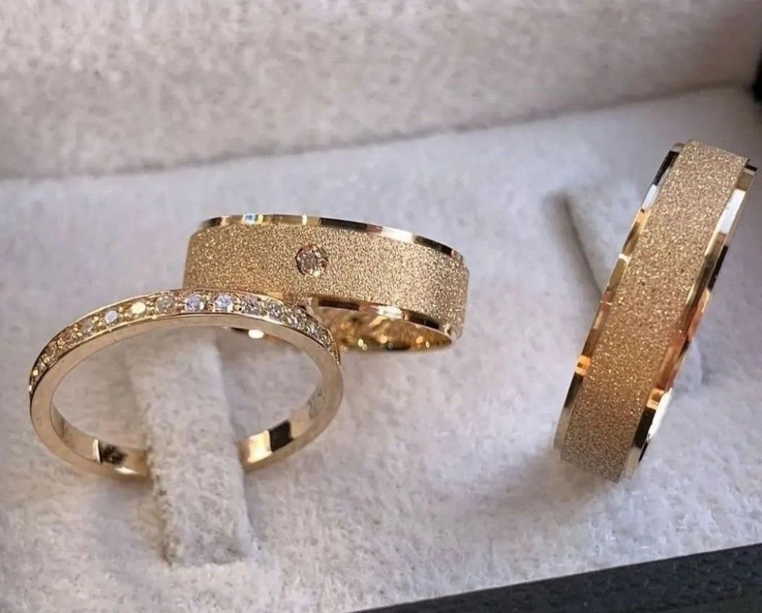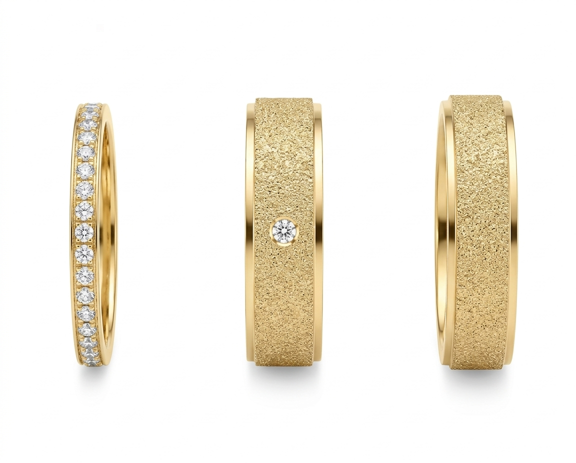 Alianzas: Presentan una base ancha con una franja central de textura diamantada o arenada, enmarcada por bordes pulidos lisos. Una de ellas incluye una pequeña piedra central.