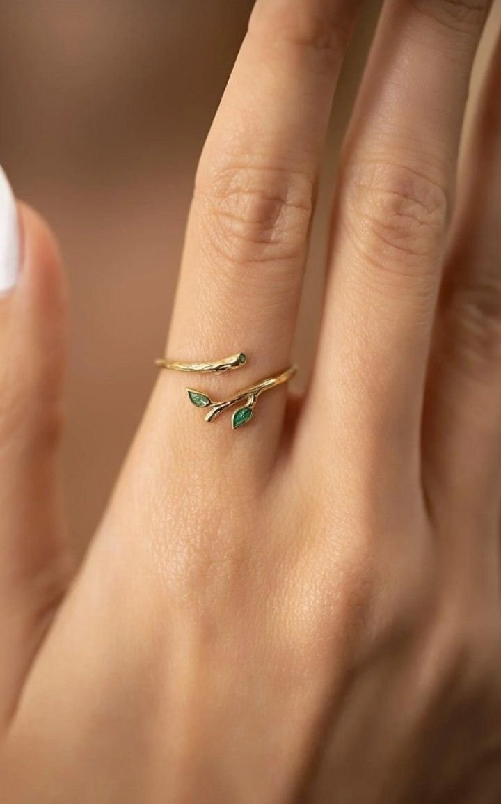 Diseño: Anillo abierto con forma de ramita delicada, adornado con pequeñas hojas verdes en corte marquesa que evocan el crecimiento natural.