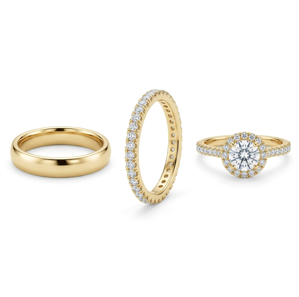 Alianza Masculina: Una banda de estilo «half-round» o media caña, clásica, lisa y de alto pulido.