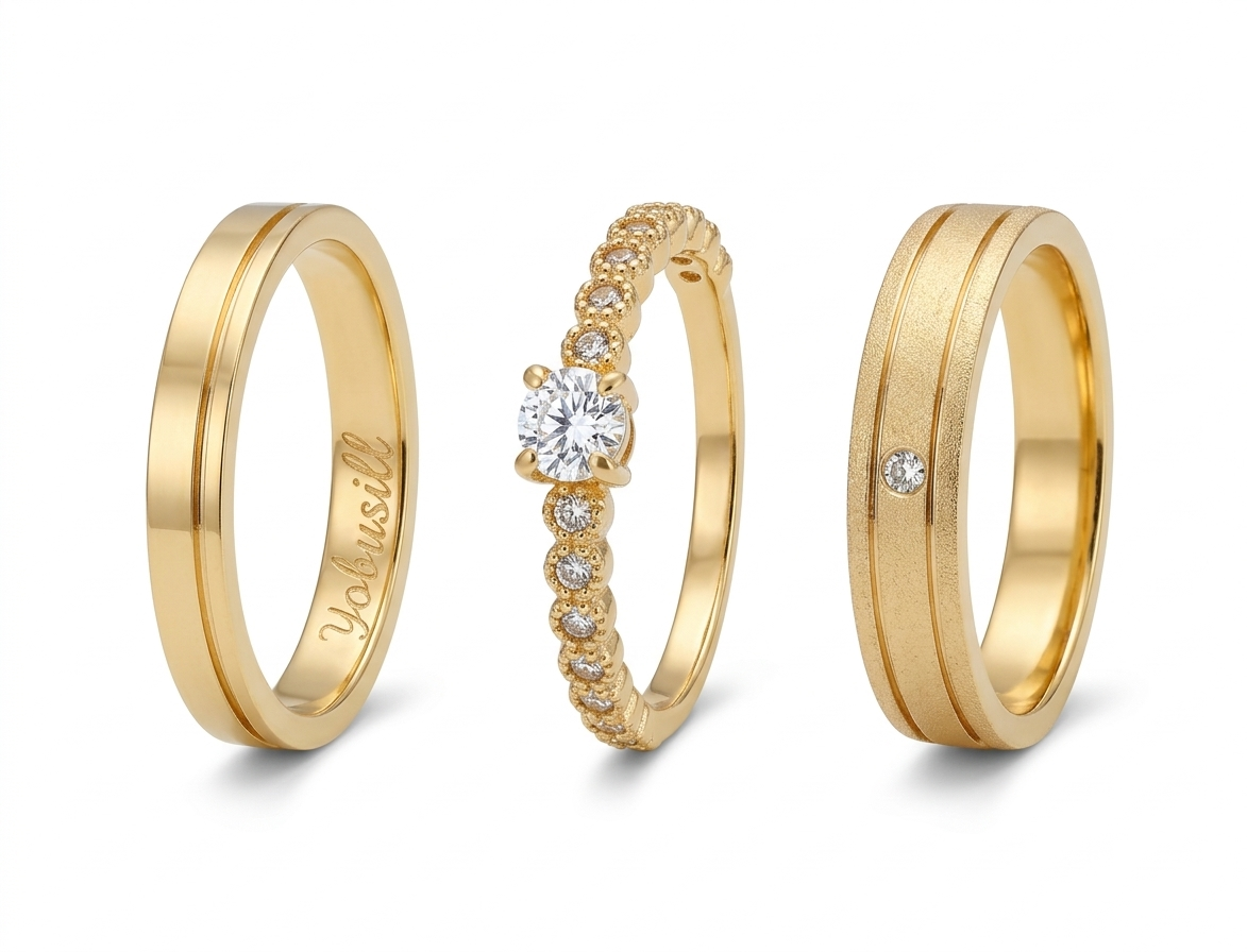 Alianzas de Matrimonio: Presentan una banda de ancho medio con un diseño bitono de texturas: una mitad de la banda tiene un acabado mate arenado y la otra mitad es lisa y pulida, separadas por un sutil surco. La alianza femenina incluye un pequeño circón incrustado.