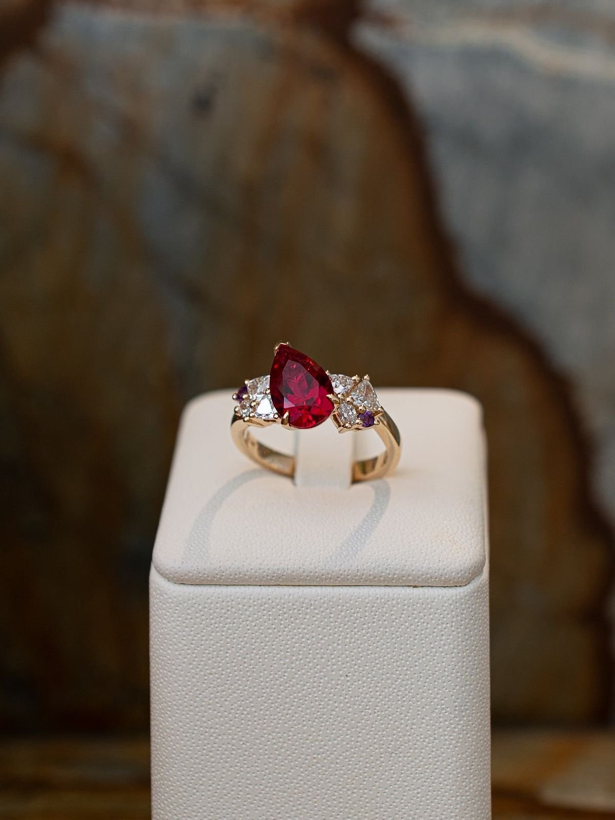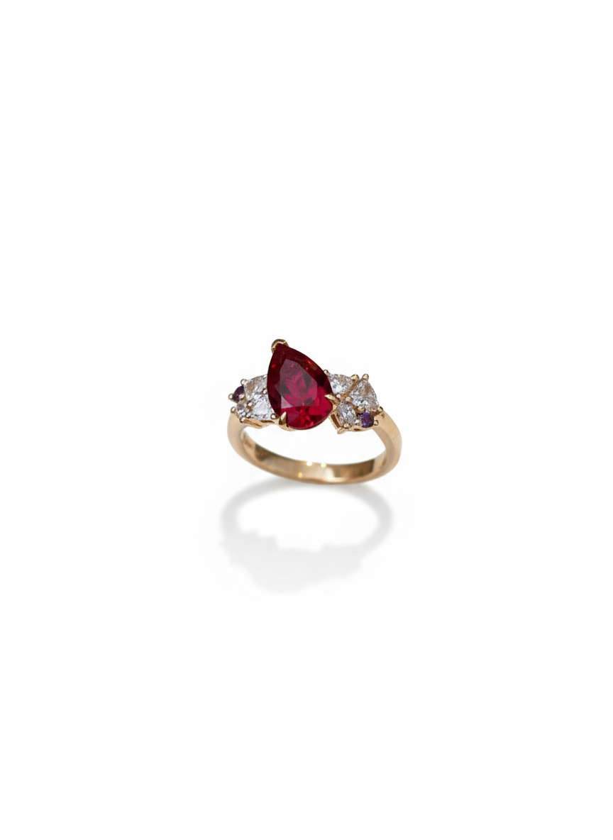 • Diseño: Diseño de racimo asimétrico. La piedra principal es de corte pera o lágrima de color rojo intenso, flanqueada por pequeñas piedras de diferentes cortes y colores.