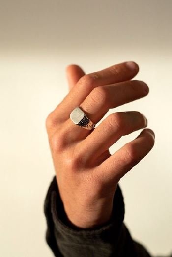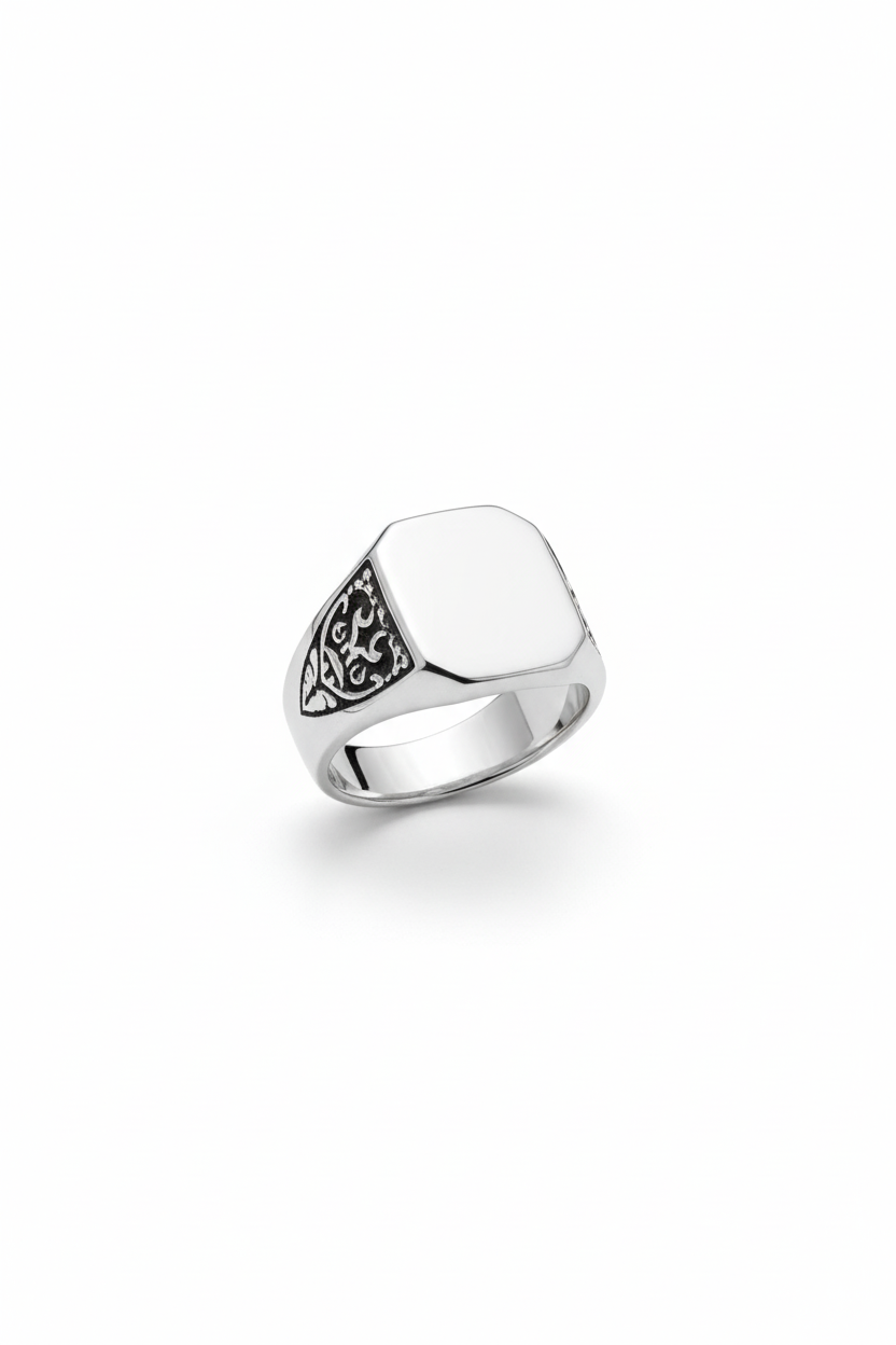 Diseño: Anillo con una plataforma superior ovalada. La parte superior lisa o tener una incrustación clara, y los laterales de la banda tienen un diseño texturizado.