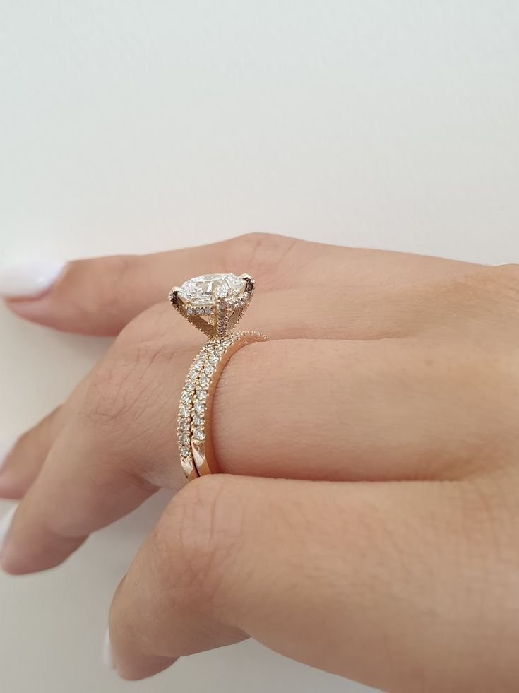 Diseño: Set de dos anillos. El anillo de compromiso tiene una piedra central grande, probablemente en un engaste de halo. Ambas bandas están completamente cubiertas con pequeñas piedras engastadas en pavé.