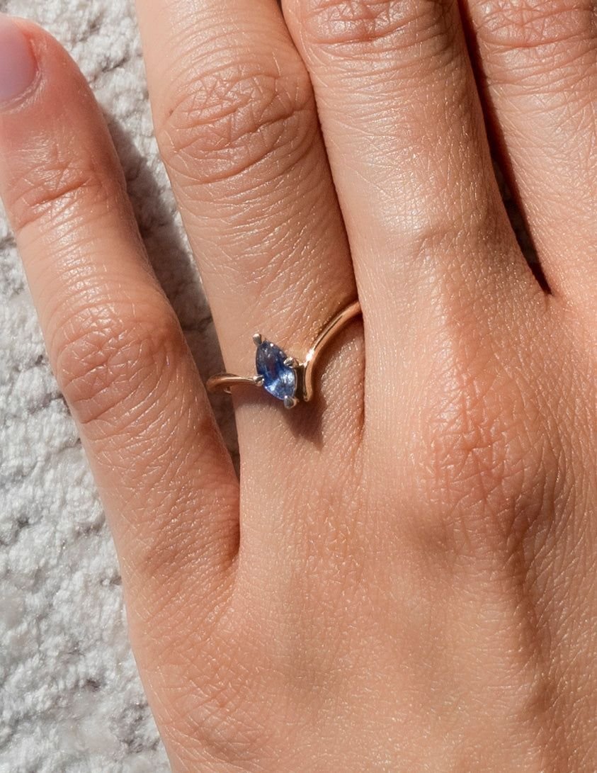 Estilo: Orgánico, Femenino y Moderno. El engaste curvo y el corte de la piedra lo hacen una pieza única y sutil.
