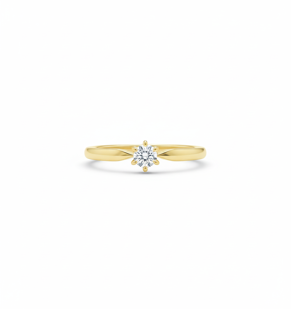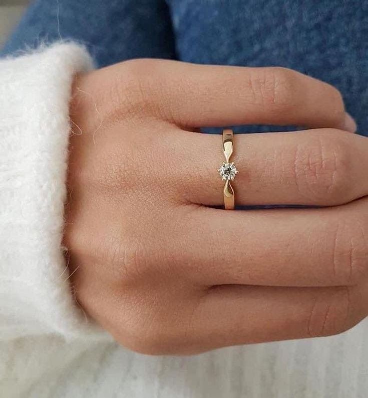 Diseño: Banda estrecha y lisa con un engaste central de tipo ilusión o estrella, donde la piedra pequeña se realza con el metal circundante.