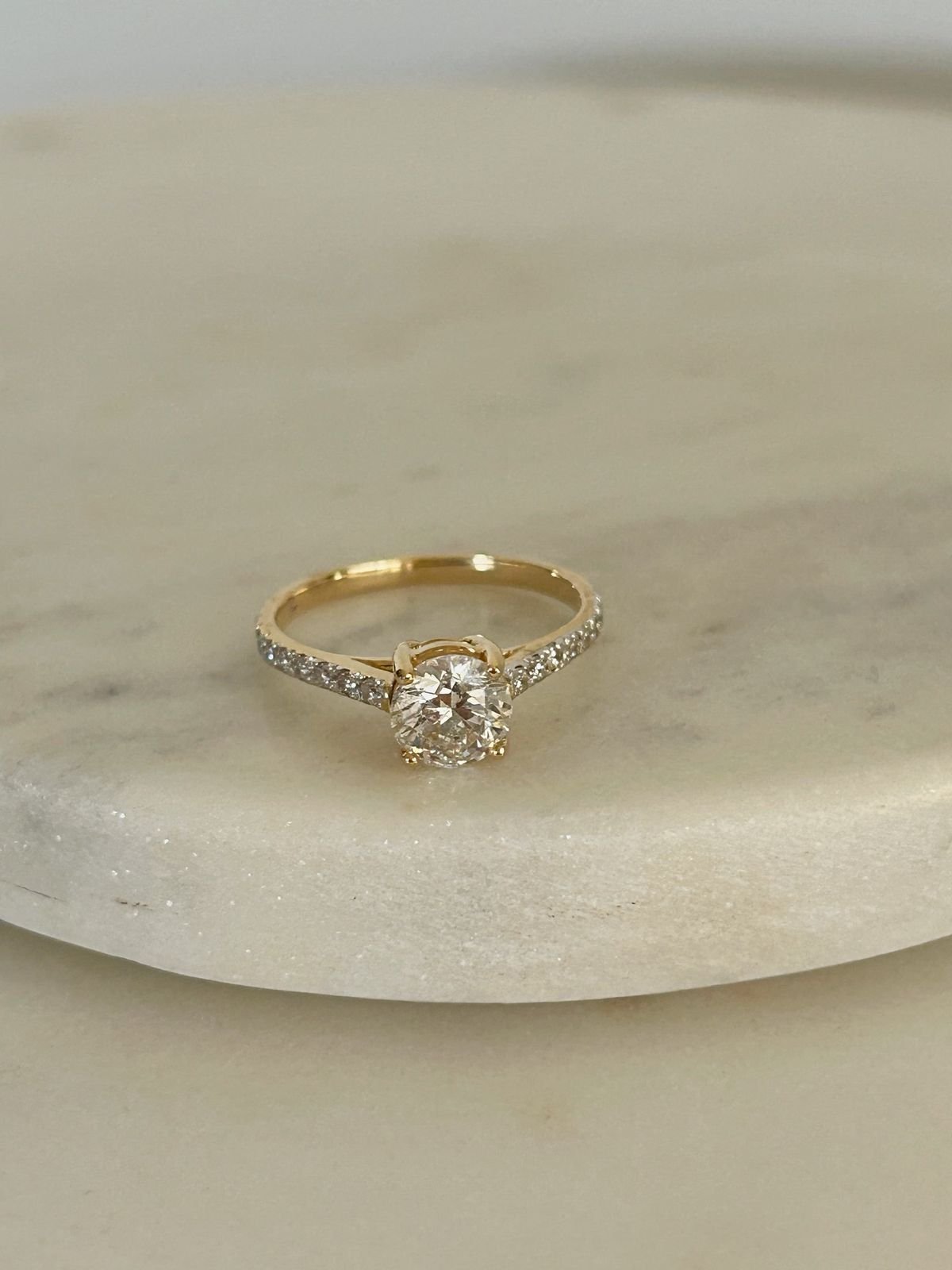 Diseño: Un solitario con una piedra central destacada, complementado con un aro engastado con pequeñas piedras preciosas a los lados, conocido como medio pavé.