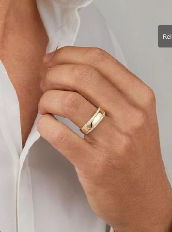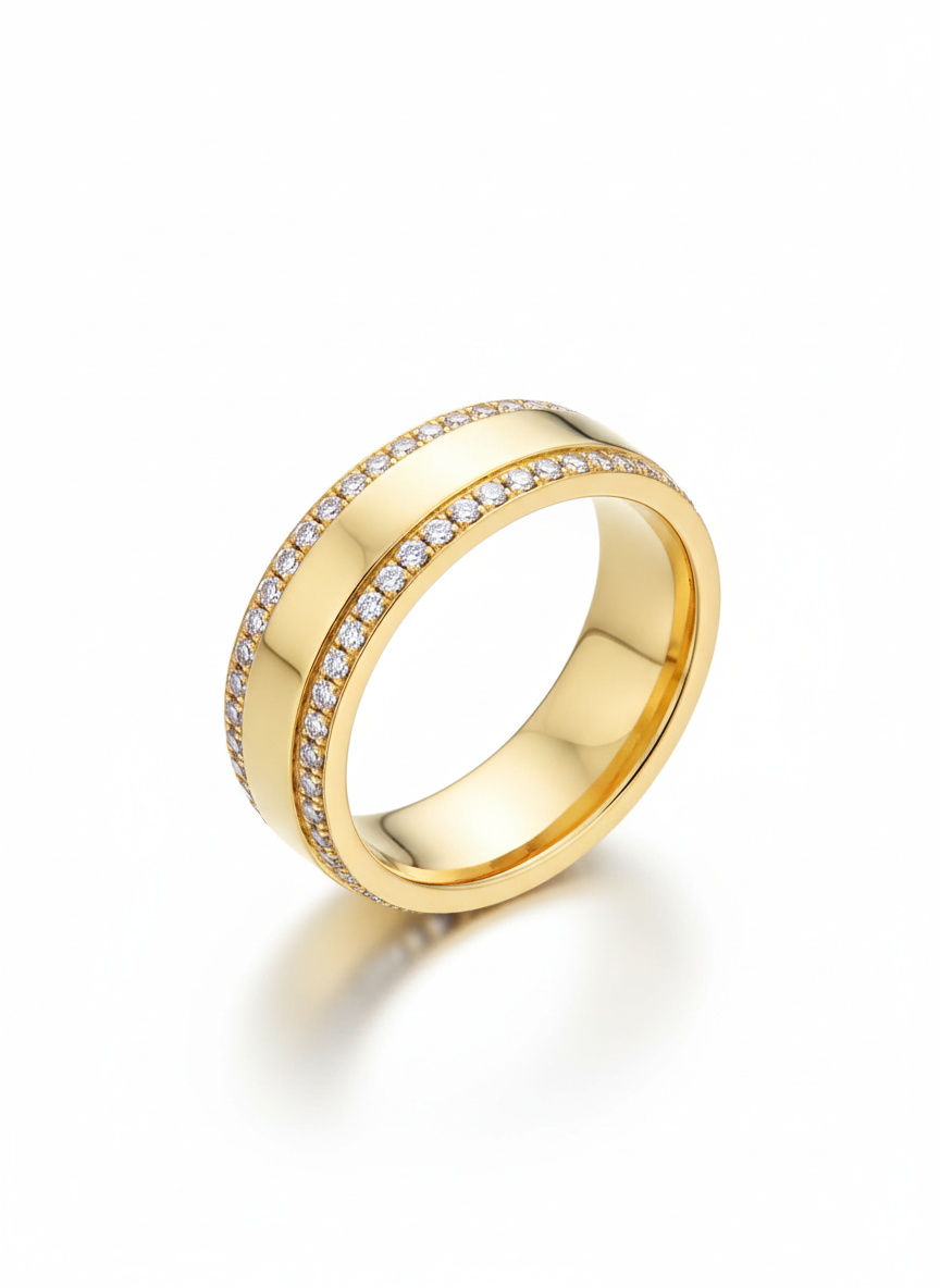 Diseño: Presenta una franja central con un patrón geométrico de facetas y los bordes exteriores están engastados con diamantes en pavé.